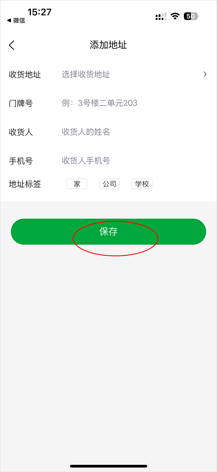 4、输入你家的地址点击保存即可外卖送货上门