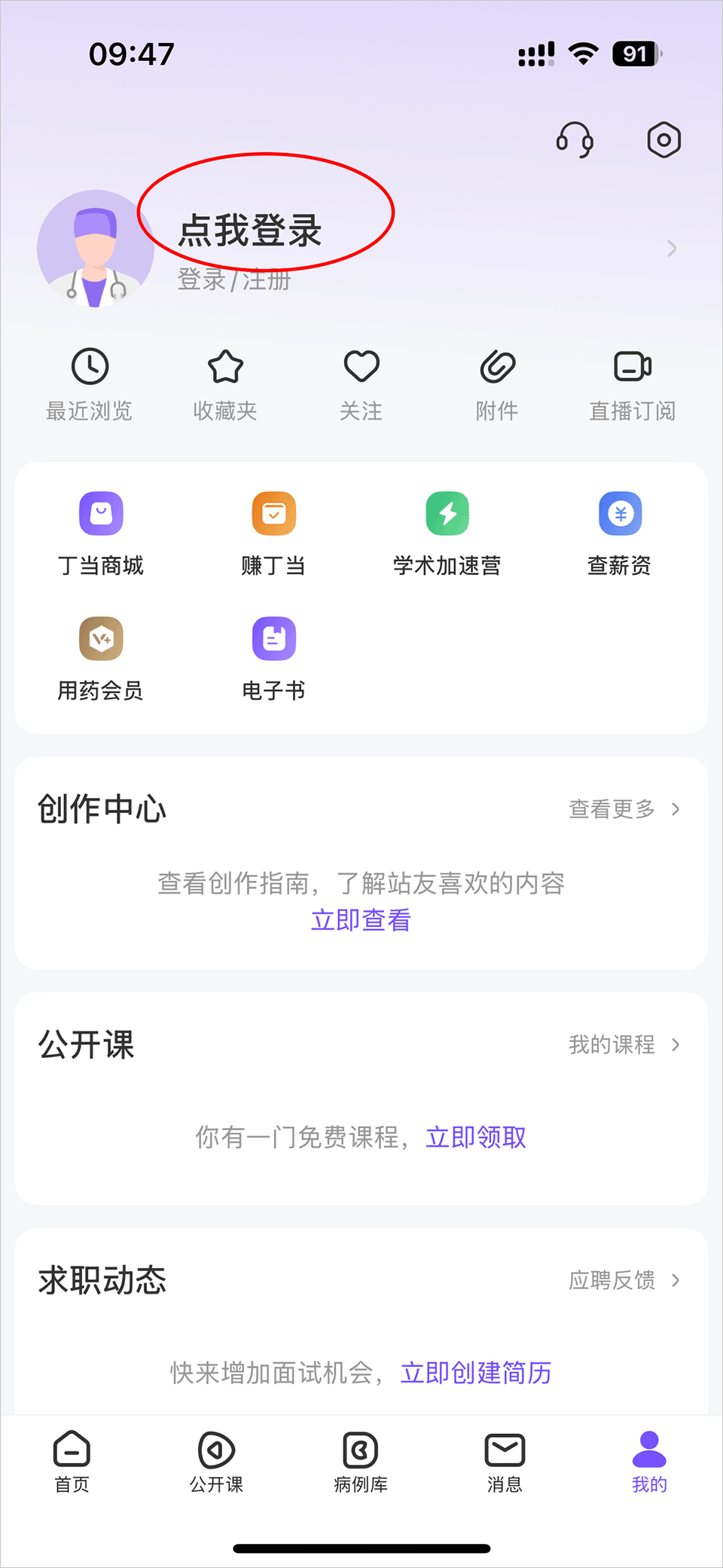 1、下载安装好丁香园app,进入软件主页,点击右下角【我的】