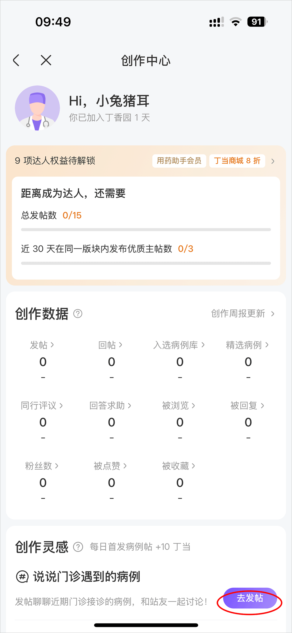 4、也可在我的页面中点击【创作中心】也可进行发帖