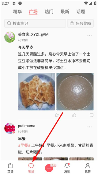 4、笔记广场展示用户分享的图文食谱,支持话题互动与关键词搜索功能。