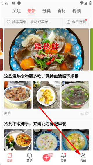 1、菜谱页面提供最新美食推荐与分类菜谱,点击底部可进入个人中心页面。