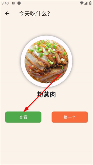 2、通过“吃什么”功能可获取随机菜品推荐,例如粉蒸肉,并支持查看或更换。