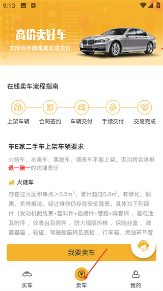 3、卖车页面明确规范交易流程,设有专用入口并提示禁止销售问题车辆。