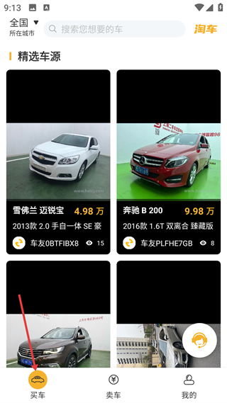 2、买车页面展示精选二手车源信息,支持城市切换与搜索功能便于筛选车型。