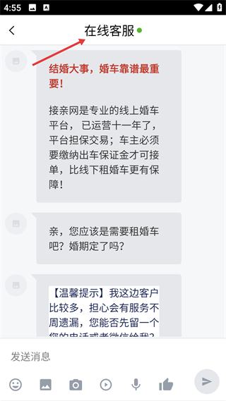2、客服页面提供在线咨询与平台保障说明,协助用户确认婚期等具体需求。