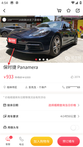 4、详情页明确车型价格与服务范围,支持选择婚期并完成预订或加入购物车。