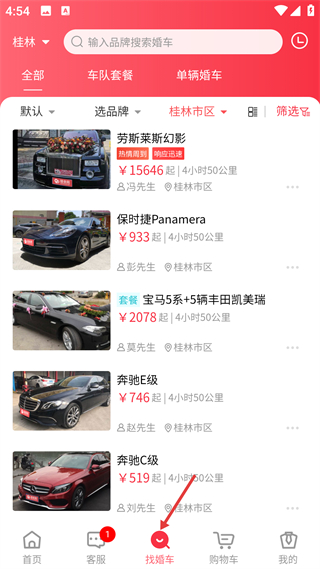 3、找婚车页面提供套餐与单车分类选项,支持多条件筛选并展示价格详情。