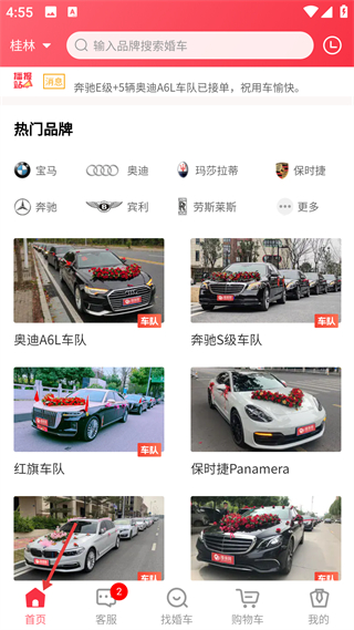 1、首页按地区展示婚车品牌与车队资源,支持直接搜索目标品牌筛选婚车。