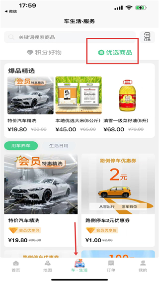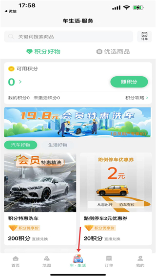 2、积分好物页面支持积分查询与积累,提供洗车等用车权益与生活商品兑换。