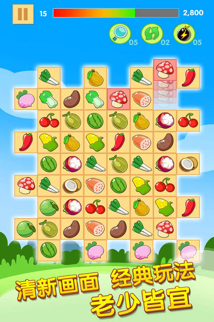 2、玩法超容易,只需连线2个及以上的同色水果就可以消除。