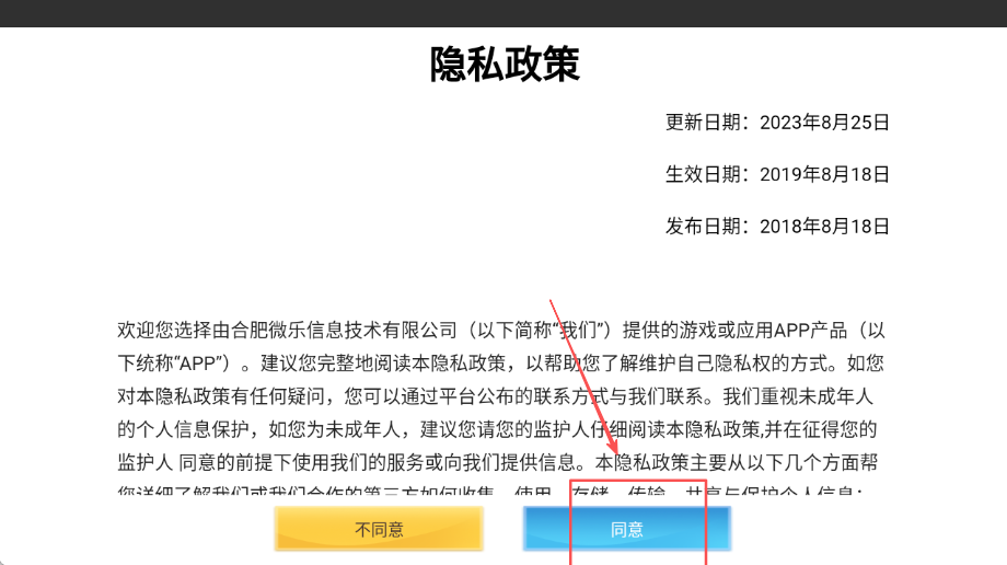 1、首先仔细阅读隐私政策条款内容并点击同意选项确认,完成游戏初始设置流程,为后续的游戏体验做好充分准备和了解,确保顺利开始冒险旅程。