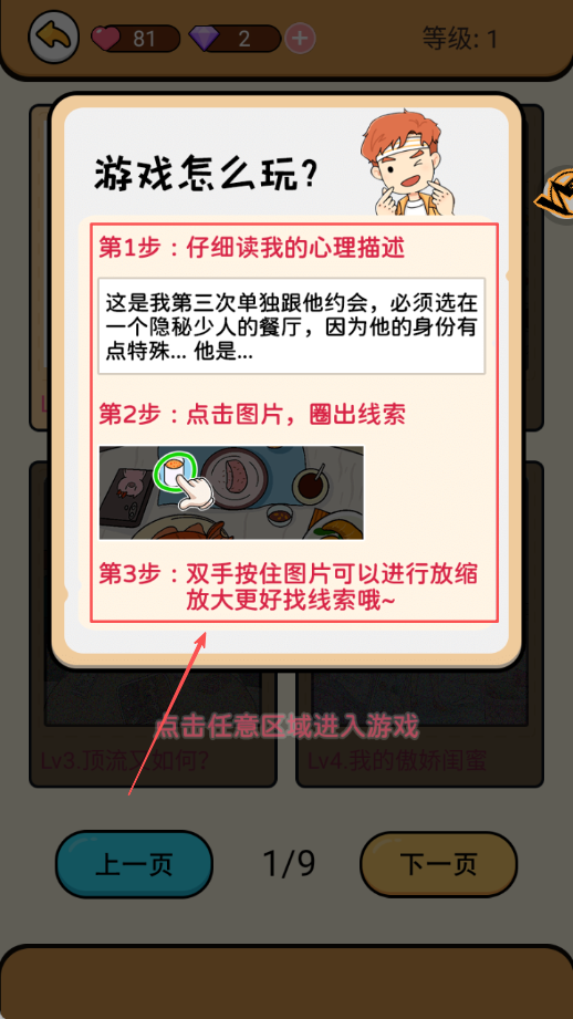 1、首先点击开始游戏按钮进入主界面选择关卡开始挑战,仔细阅读每个关卡的背景介绍和任务目标要求,为后续的解谜过程做好充分准备。