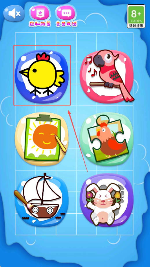 1、首先进入游戏主界面后仔细寻找红色框内的小鸡图标位置,轻轻点击这个图标开始游戏体验,为后续的互动学习做好准备。