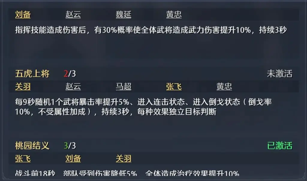 11、部分武将之间存在一定的缘分效果,可以在每个武将的缘分模块单独查看,一旦缘分激活则会有不同的增益效果。