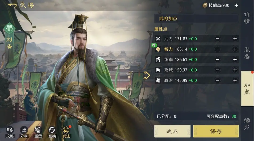 4、武将每升10级可以获得10点属性,满级共计50点,可以自由分配,一般来说全点推荐属性即可。