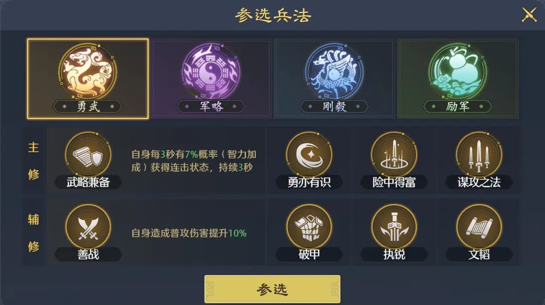 3、兵法系统的养成也很简单,我们先选择兵法派系方向(从勇武、军略、刚毅、励军中4选1),然后用20点领悟点(分解紫色信物获得)去激活主修兵法。
