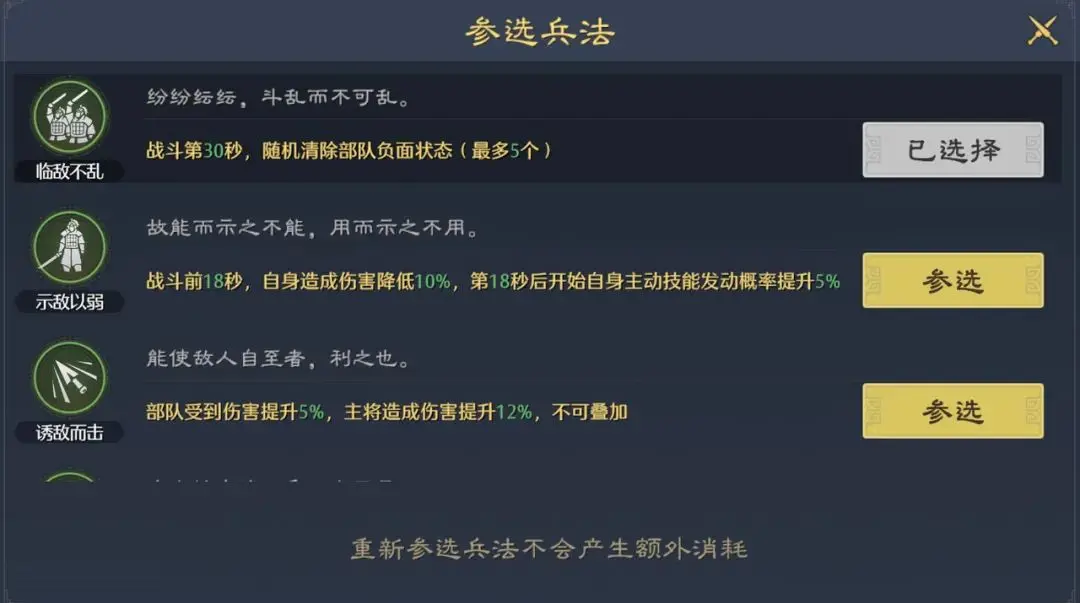 4、剩下的3个小的兵法槽需要随着武将等级提升逐渐解锁。同样是使用领悟点去激活,辅修兵法则是9选1,整体搭配非常灵活。