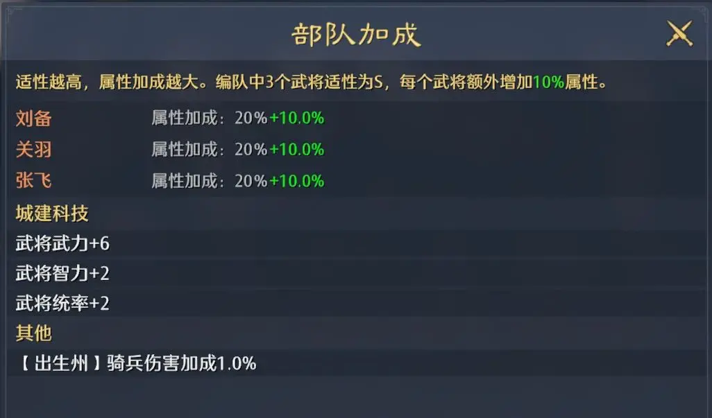 6、三个武将如果能凑到同兵种组成3S阵容,那么还可以额外获得10%属性,是十分强大的增益效果。