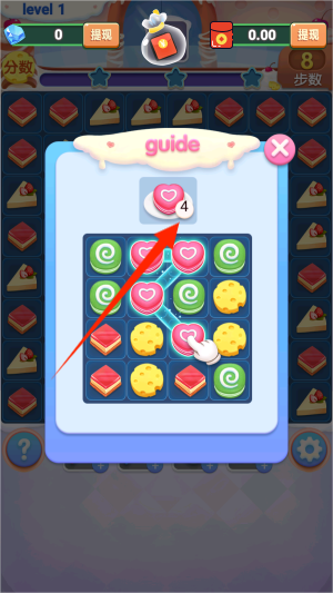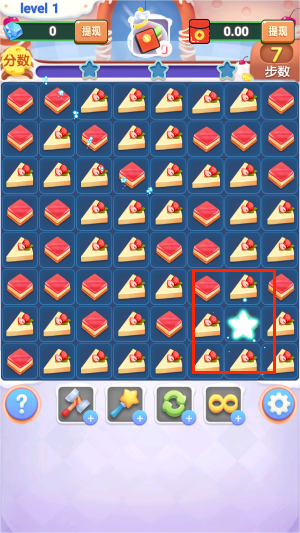 2、在限定步数或规定时间内完成每关的特定目标,如清除指定颜色的糖果或达到最低分数要求,方可进入下一关卡。