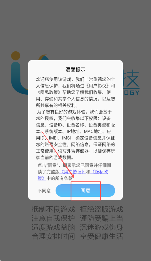 1、首先点击同意按钮确认用户协议和隐私政策条款内容,完成游戏初始设置流程,为后续游戏体验做好准备并熟悉基本操作。