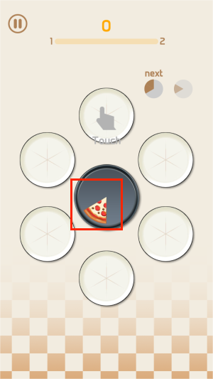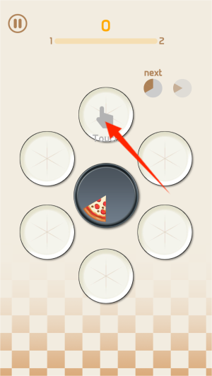 1、通过长按屏幕控制悬空披萨的移动轨迹,精准投放到合适位置,使相同等级的披萨接触后自动合成高一级新品。