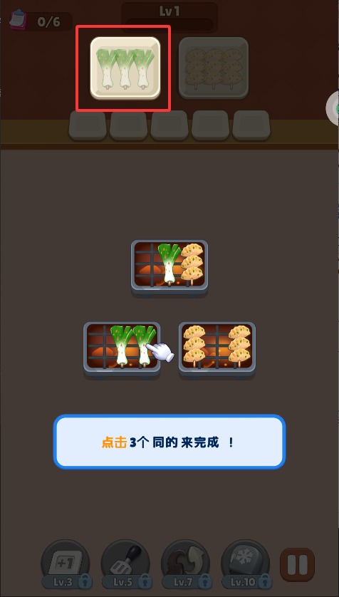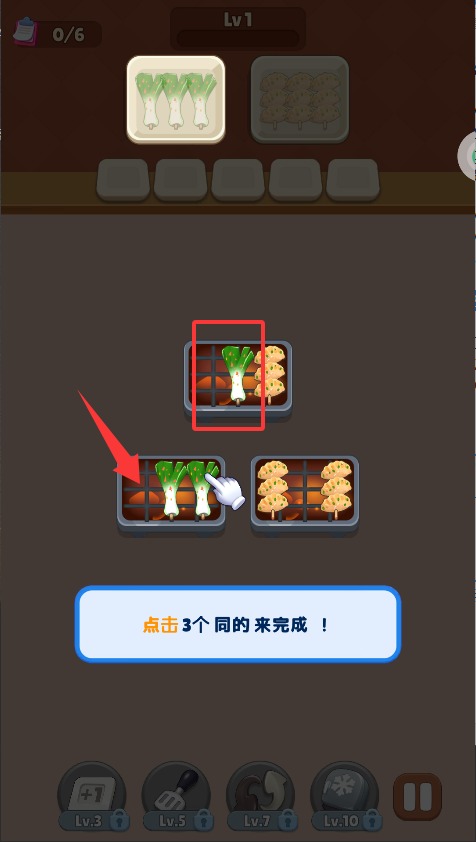 2、点击相邻的三个相同烤串图案形成连线,成功连接后自动消除并计入完成进度,连续消除多组可触发特殊加分效果。