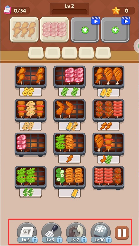 1、根据屏幕顶部显示的顾客订单要求,在限定时间内找出对应的烤串图案,按照指定数量完成餐品搭配与提交流程。