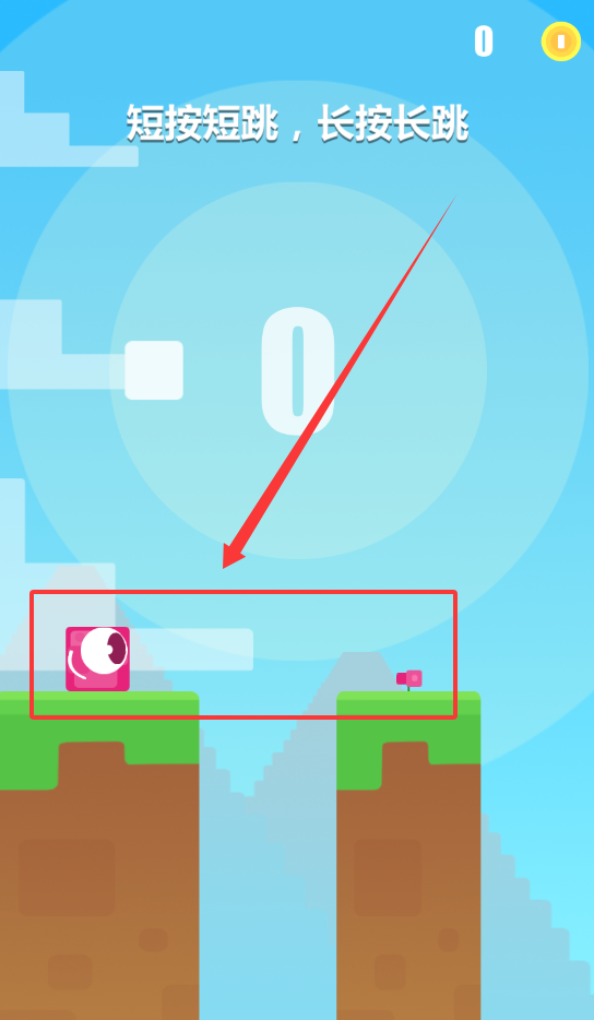 1、进入游戏后,玩家需要操控单眼方块角色,通过点击屏幕的时间长短来控制跳跃力度与距离,需要注意掌握合适的力度。
