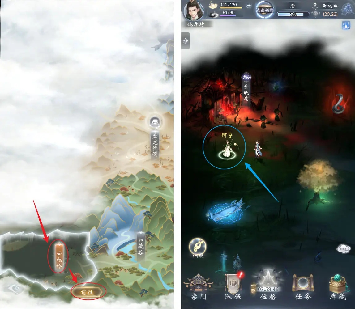 2、选择云栖谷并点击前往,向地图左上角走,找到阿宁,与她对话。