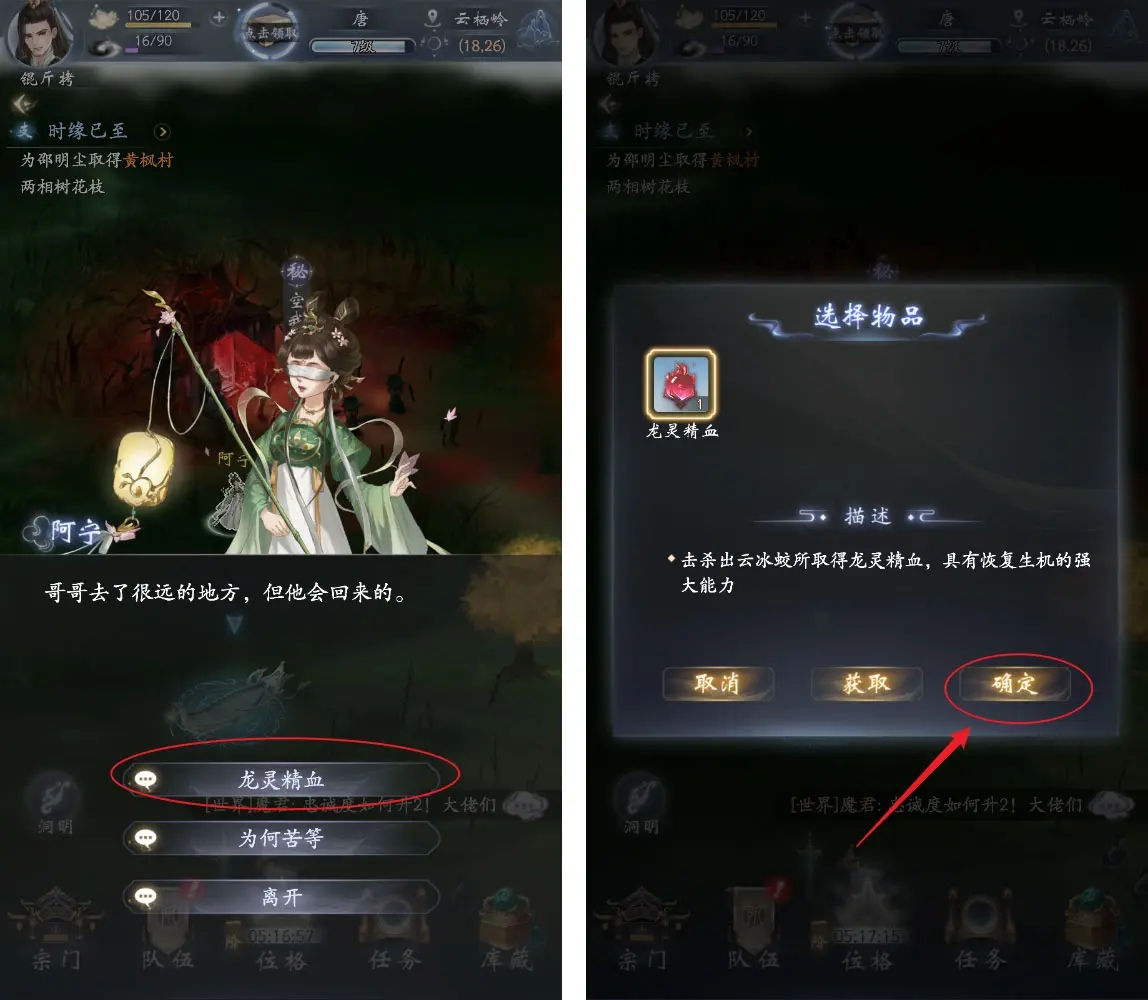 7、战胜后可以获得龙灵精血,我们再次找到阿宁,与她对话,然后点击龙灵精血,点击确定后,任务完成。