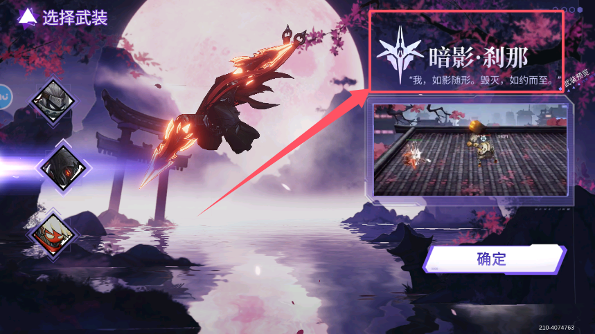 2、随后切换至"暗影·刹那"武装的详细展示页面,评估其技能效果与实战价值。确定选用后完成装备操作,确保在后续战斗中能够调用该武装的特殊能力。