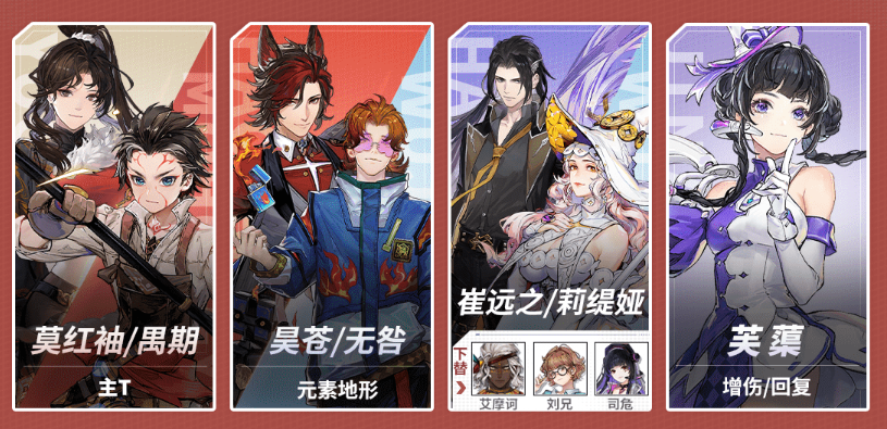 成型风队缺少激励手段,需要考虑后台角色跟烙痕配合获取激励,莫红袖、禺期、龙晴、田诺等角色都是出于这种考虑,可以登场叠加完激励之后换下替补席,莫红袖禺期等还可以在高压环境下留在前台担任主T。