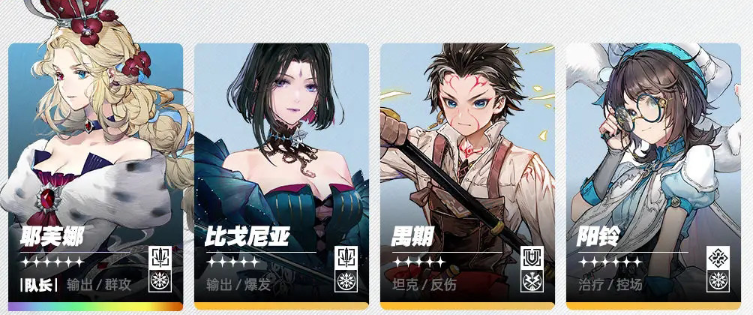 队长优选耶芙娜提高队伍整体伤害,次选阳铃/比戈尼亚等能提供激励的角色。霜冻队在有出色的水元素地形制造者时并不刚需坦克角色,可在替补席放置以备不时之需。