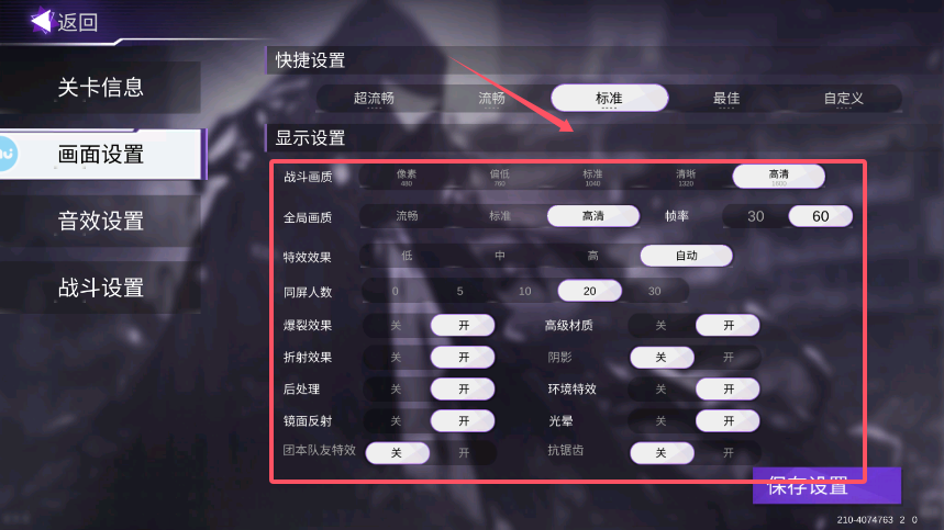 2、进入画面设置模块,根据设备性能选择最佳配置。推荐开启60帧模式与高清画质,在保证流畅度的同时享受精致视觉效果。保存设置后立即生效,显著提升游戏体验。