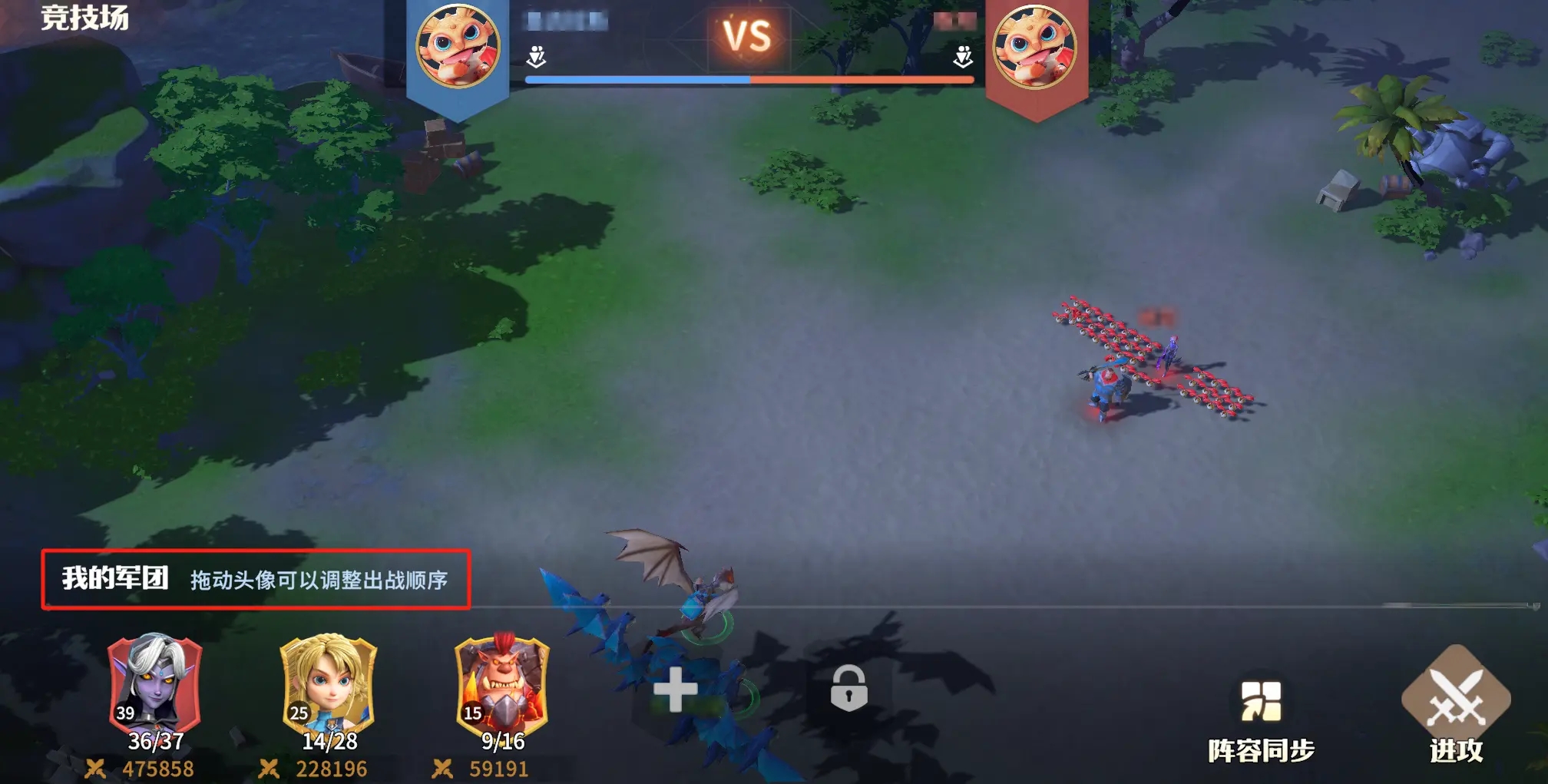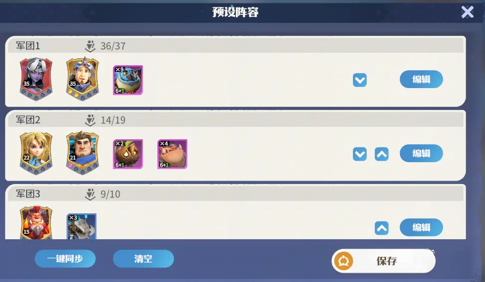 根据玩家现有英雄,士兵,科技等级,配置阵容,最多可以上场5只队伍,可以手动调整队伍配置和上场顺序,也可以一键同步现有队伍。