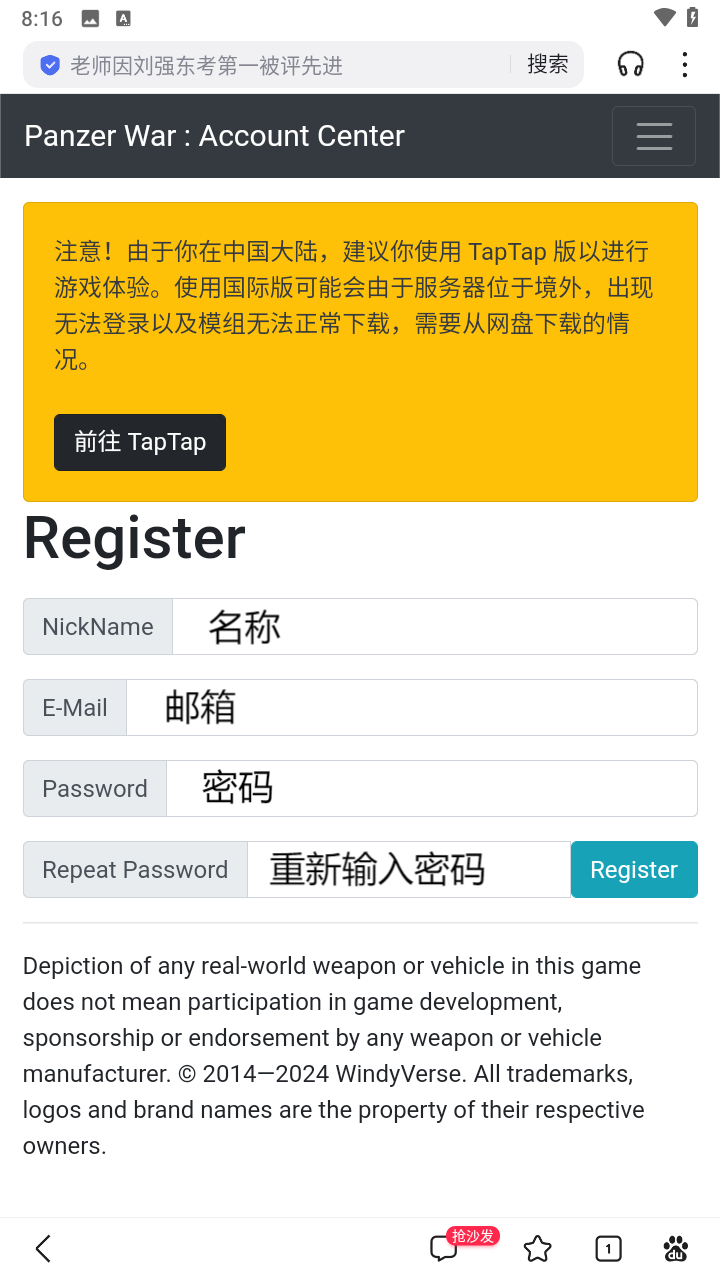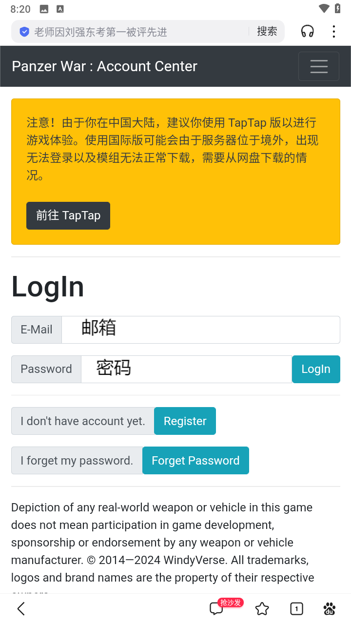 4、回到游戏页面输入你刚才注册的邮箱与密码。