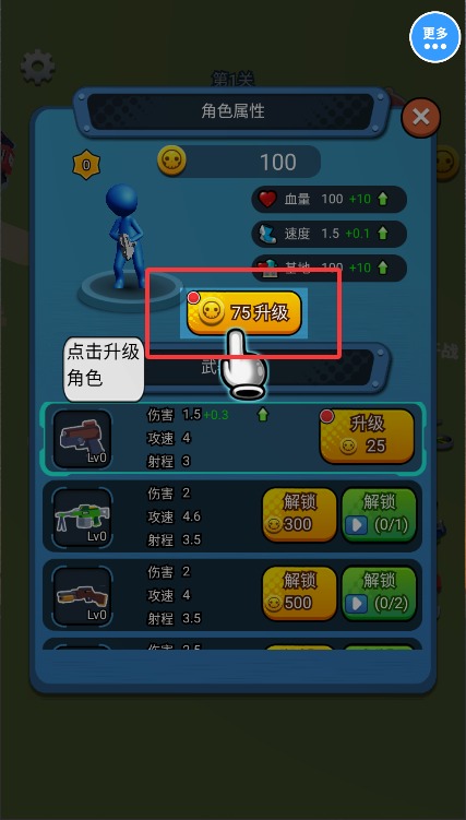 3、在角色升级时点击属性强化界面,从攻击力、射程等不同属性中选择需要提升的数值,每次升级可获得三点分配点数。