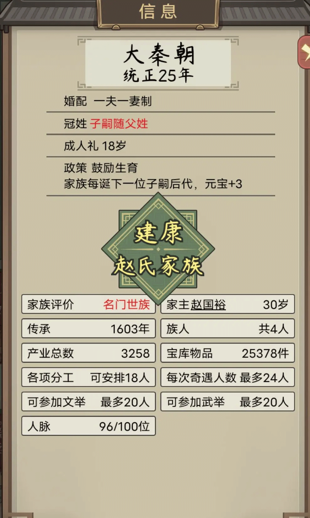 赵氏家族经过几代人努力(就是肝,爆人口)终于达成名门望族!到这里算是通关了!