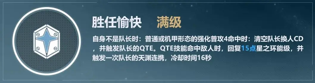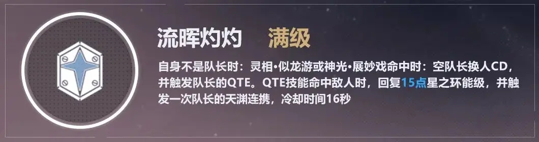 升变队的独有玩法,对标共鸣队的共鸣标记、影队的影侍机制。点按头像后即可释放队友角色的特殊QTE,角色出场后会获得一段时间的强化状态,强化状态期间角色能享受到所有星环爆发期间的增益效果,伤害会得到提升,技能效果也会发生变化。不过这个强化状态并不属于星环爆发,只是能享受到相应的增益而已。
