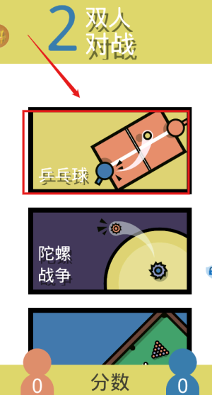 1、启动程序进入双人对战主界面,乒乓球陀螺战争等模式罗列眼前分数统计一目了然。