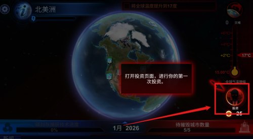3、北美洲地图显示全球温度十七度指标,待推罗五座城市全部激活,2026年一月正式启动投资计划。
