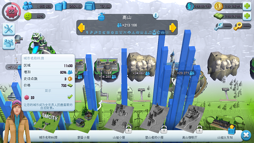 高山系统会在玩家到达23级时解锁,它的建造模式和沙滩一样。它没有一个总部,不需要先建造一个建筑才能产出其他建筑。而游戏中建造菜单中越往右边即越高级的建筑大多需要先建造左边低级的建筑后才能解锁。同样的,高山设施的建造大多需要的是金钥匙作为材料,少数高山建筑需要绿钞才能建造,比如第一项的城市名称标牌,它能够让你的城市名称印到山体上,让其他玩家进入你的城市时一眼就能看到你的城市名。