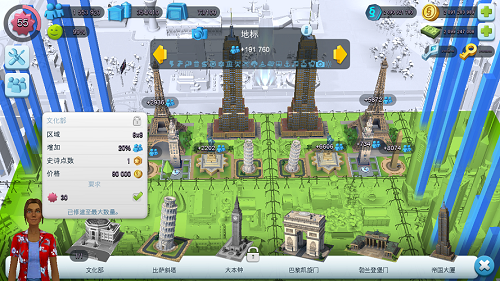 当玩家的游戏等级到达30级时,就可以解锁文化部,修建文化部之后就能建筑世界各地宏伟壮观的地标建筑了。