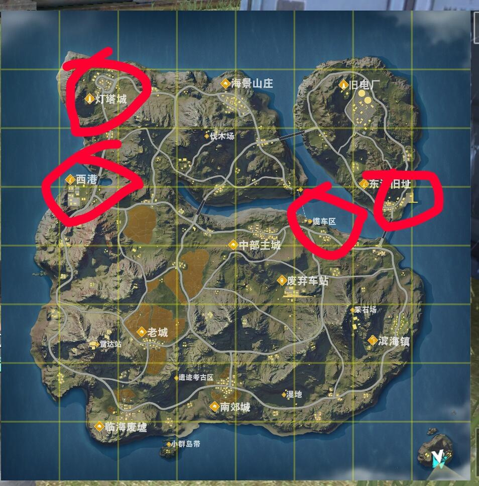 6、尽量不要选择中心城或者老城,旧电厂,灯塔城这种兵家必争之地,初期还是安稳发育的好。(红圈为个人喜好跳点