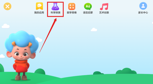 2、点击我的应用入口呈现五大功能模块,科学探索数学思维语言启蒙艺术创意分类清晰,家长中心提供监护设置。