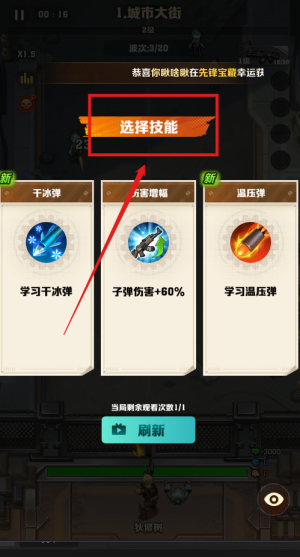 1、击败三波敌人后解锁技能选择界面,干冰弹温压弹各具特色,伤害增幅提升六十百分比。