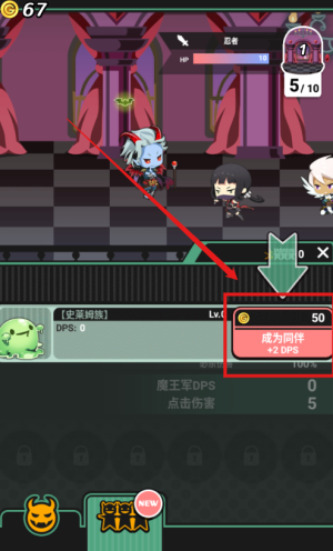 4、招募史莱姆族成为同伴消耗五十资源,增加二点DPS扩充魔王军,点击伤害同步提升至五单位,实力稳步增长。