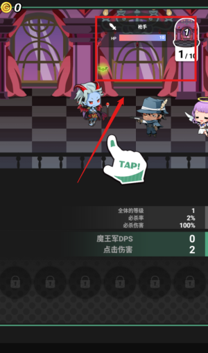 2、主界面显示全体等级必宗率等核心属性,魔王军DPS与点击伤害数值清晰,百分百必宗率确保攻击百发百中。
