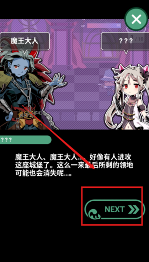 1、启动魔王大人进入开场剧情,领地遭攻仅剩最后一座城堡,点击NEXT按钮推进故事,了解复仇背景与形势危急。