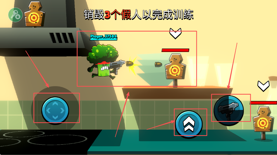 1、首先点击屏幕上的射击按钮完成基础训练任务,准确销毁五个假人目标以熟悉游戏的基本操作方式和控制要领,为后续经营做好准备。